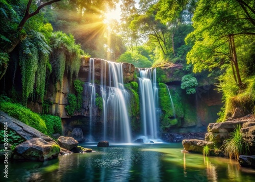 © Man888, Obraz premium Lush Rainforest Waterfall Cascading over Ancient Stone Architecture
