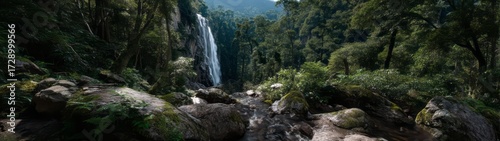 © Ayou.Y, Obraz premium Lush rainforest waterfall hdri panoramic view nature environment 360-degree equirectangular scene