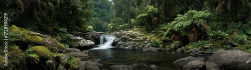 © Ayou.Y, Fototapeta premium Lush rainforest waterfall hdri panoramic view nature scene serene environment