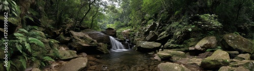 © Ayou.Y, Fototapeta premium Lush rainforest waterfall vibrant nature hdri panoramic view scenic environment