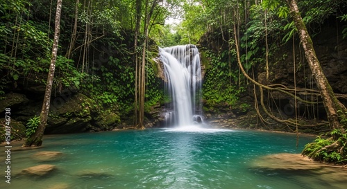 Fototapeta premium Lush Rainforest Waterfall with Clear Pool, Moss-Covered Rocks and Tropical Greenery, Vibrant Jungle Scene, Tropical Waterfall Landscape