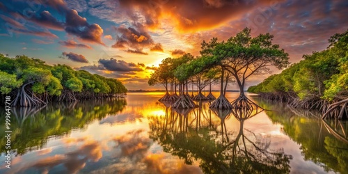 © Autun, Obraz premium Lush Red Mangrove Forest at Sunset with Vibrant Roots and Reflections in Calm Water Landscape Scene