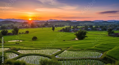 © Endang, Fototapeta premium Lush rice paddies at sunset