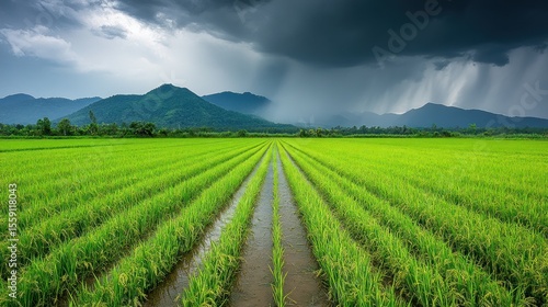 Fototapeta premium Lush rice paddy field, dramatic sky