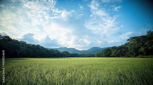 © nur, Fototapeta premium Lush rice paddy stretches to a mountain range under a vibrant sky.