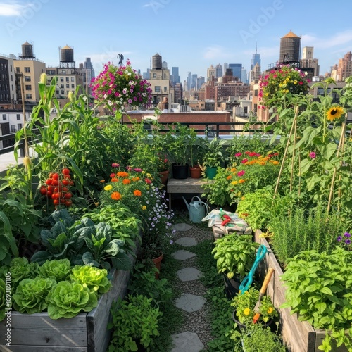 Fototapeta premium Lush Rooftop Garden Oasis in Urban Setting.