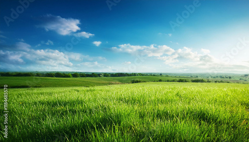 © Valentin, Obraz premium lush spring inexperienced grass historical past with a summer blue sky over fields and pastures