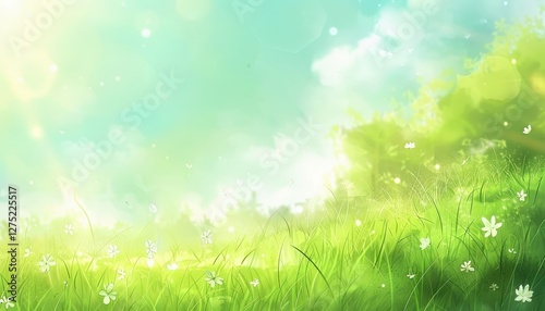 © Hmen, Obraz premium Lush spring landscape featuring flowers and green grass, for peaceful nature backgrounds