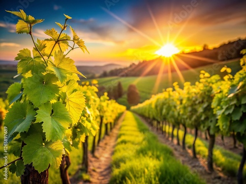 © Man888, Fototapeta premium Lush Spring Vineyard Sunset: Sunstar Backlit Grapevines