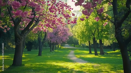 Naklejka premium Lush Springtime Park Scene with Blooming Trees and Greenery