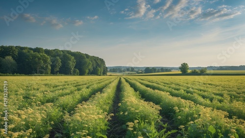 Naklejka premium Lush Summer Field Landscape with Rows of Vegetation and Clear Sky for Text Placement and Nature-Themed Designs