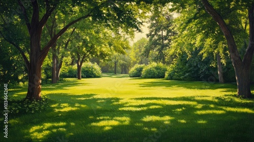 Fototapeta premium Lush summer landscape featuring a sunlit park with a glade of vibrant green grass