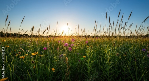 Fototapeta premium Lush, sun-drenched meadow bursting with vibrant summer wildflowers and tall green grasses under a clear blue sky. Golden hour light bathes the abundant nature, lush, foliage, sunny