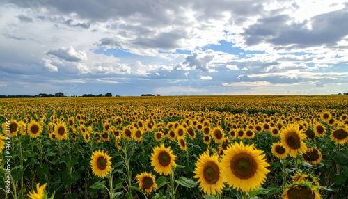 Fototapeta premium Lush Sunflower Field Under Expansive Blue Sky with Soft Clouds