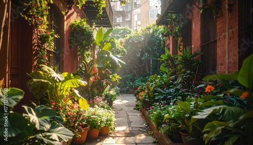 Naklejka premium Lush, sunny alleyway with vibrant plants, stone path, and brick buildings