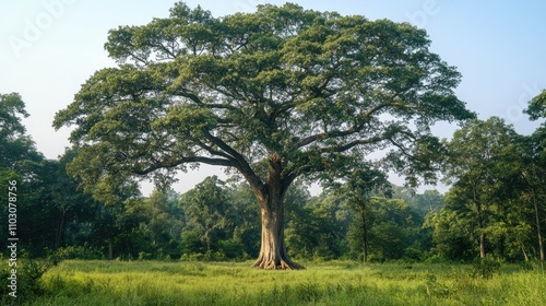 Obraz premium Lush tall tree with expansive canopy standing proudly in a serene, green...
