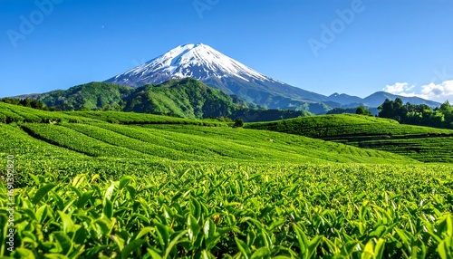 © Muna, Fototapeta premium Lush tea fields with snowy mountain