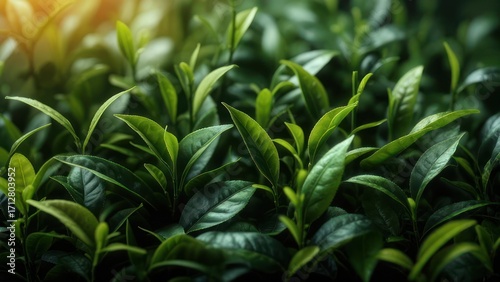 © imron, Fototapeta premium Lush tea leaves in sunlight
