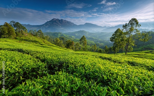 © Ernawati, Fototapeta premium Lush tea plantation landscape at sunrise (1)