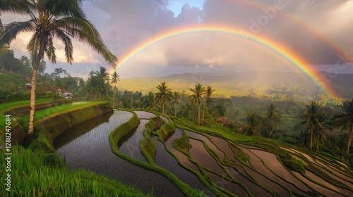 © mryanfahrudin1, Obraz premium Lush terraced rice fields under a vibrant rainbow, showcasing nature's beauty in Bali