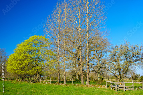 © Lars Johansson, Obraz premium Lush trees at a meadow and a hiking trail in the spring