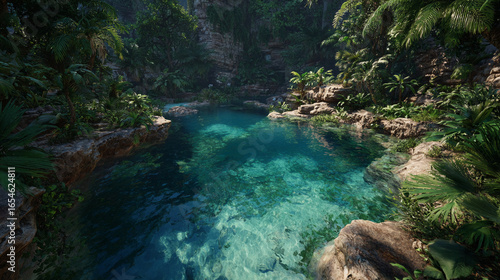 Naklejka premium Lush Tropical Cenote: Crystal Clear Water & Exotic Plants