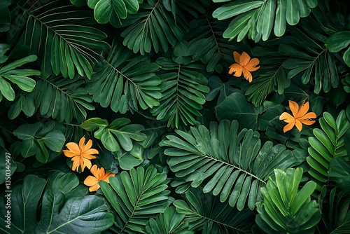 © Amron, Naklejka premium Lush Tropical Foliage and Orange Blossoms Background