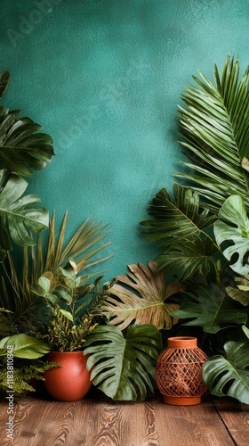 © Ai DreamscapesTH, Fototapeta premium Lush Tropical Foliage and Terracotta Potted Plants Against a Teal Wall Background