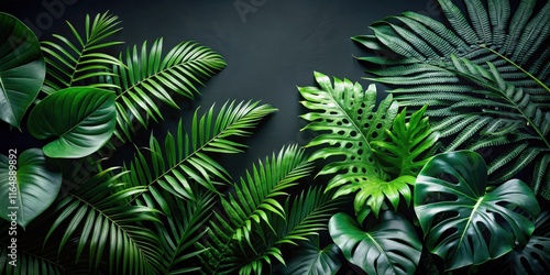 Fototapeta premium Lush Tropical Foliage Arranged Against a Dark Background for Design and...