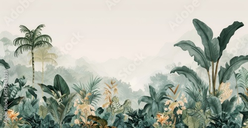 © Letitia, Fototapeta premium Lush tropical foliage in a misty jungle setting.