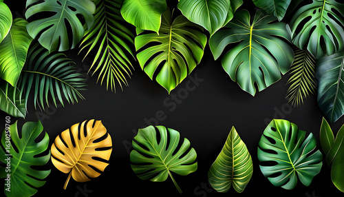Naklejka premium Lush Tropical Foliage with Golden Leaf on Black Background, Arti