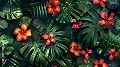 Naklejka premium Lush Tropical Foliage with Vibrant Red Flowers.