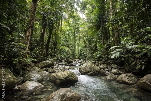 © Hayra, Obraz premium Lush Tropical Forest Stream Scene