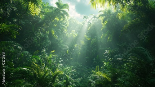 Obraz premium Lush tropical forest with sunlight filtering through the canopy.