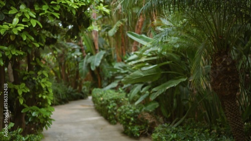 Naklejka premium Lush tropical garden path featuring blurred greenery, evoking a luxurious...