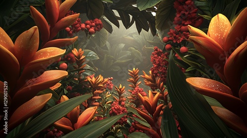 © Cuan, Fototapeta premium Lush Tropical Garden with Red and Orange Flowers