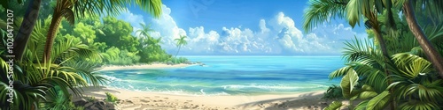 © Anat art, Fototapeta premium Lush tropical greenery blends seamlessly into a peaceful beach, where soft sand meets calm turquoise waves and a clear sky. Generative AI