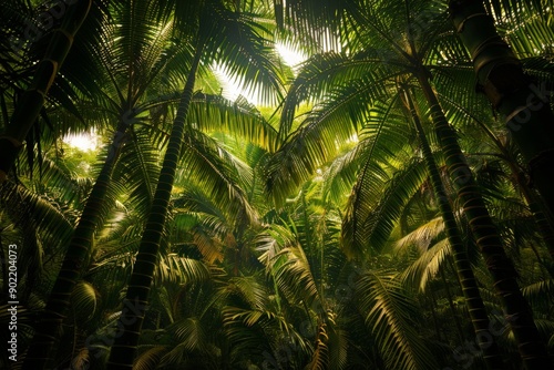 © Mandeep, Fototapeta premium Lush Tropical Jungle: Exotic Palm Trees and Sunlight Filtering Through