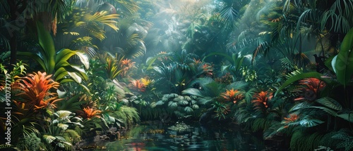 © Starkreal, Obraz premium Lush Tropical Jungle Paradise with Exotic Flora and Fauna in Vivid Colors