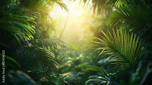 Fototapeta premium Lush tropical jungle scene with sunlight filtering through dense foliage.