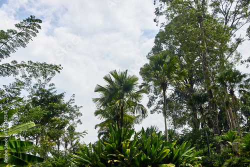 © elenavolf, Obraz premium Lush tropical jungle with palm trees and dense green foliage under cloudy sky.