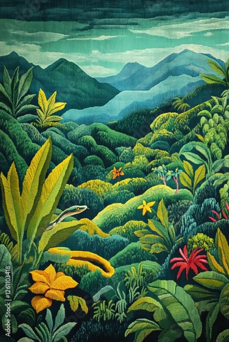 © Murda, Fototapeta premium Lush tropical landscape, snake hidden in vibrant foliage.
