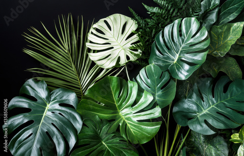 Fototapeta premium Lush tropical leaves arranged beautifully on black background create vibrant and serene atmosphere, perfect for nature lovers and interior design enthusiasts
