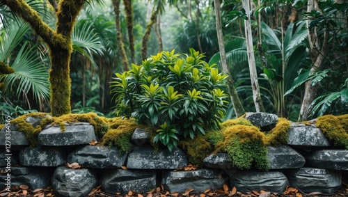 Fototapeta premium Lush tropical plant surrounded by moss and stones creating a serene jungle...