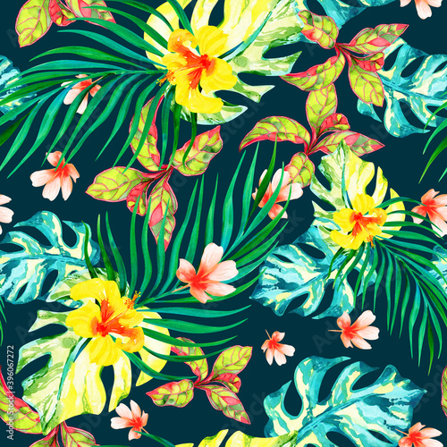 © AineGing, Naklejka premium lush tropical plants seamless pattern, floral print on black background, watercolor illustration.
