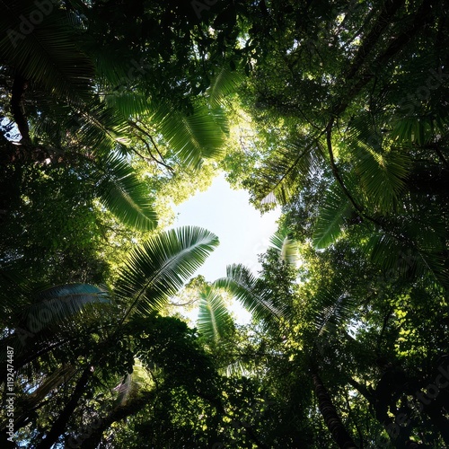 Obraz premium Lush Tropical Rainforest Canopy Looking Up at Sky, Sunlight Filtering Through...