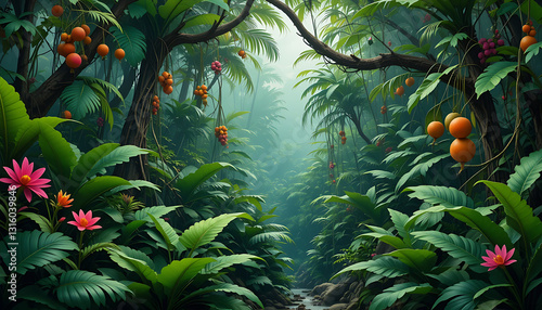 © Sam, Fototapeta premium Lush Tropical Rainforest Path: Exotic Plants & Fruits