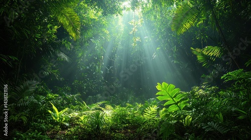 © AFFANYUDA, Obraz premium Lush tropical rainforest sunlight