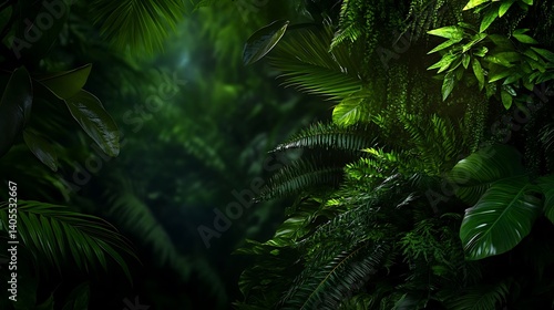 Fototapeta premium Lush Tropical Rainforest with Dark Green Foliage Background.