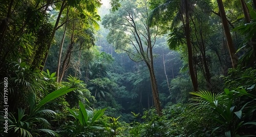 Obraz premium Lush tropical rainforest with vibrant green foliage and sunlight filtering...